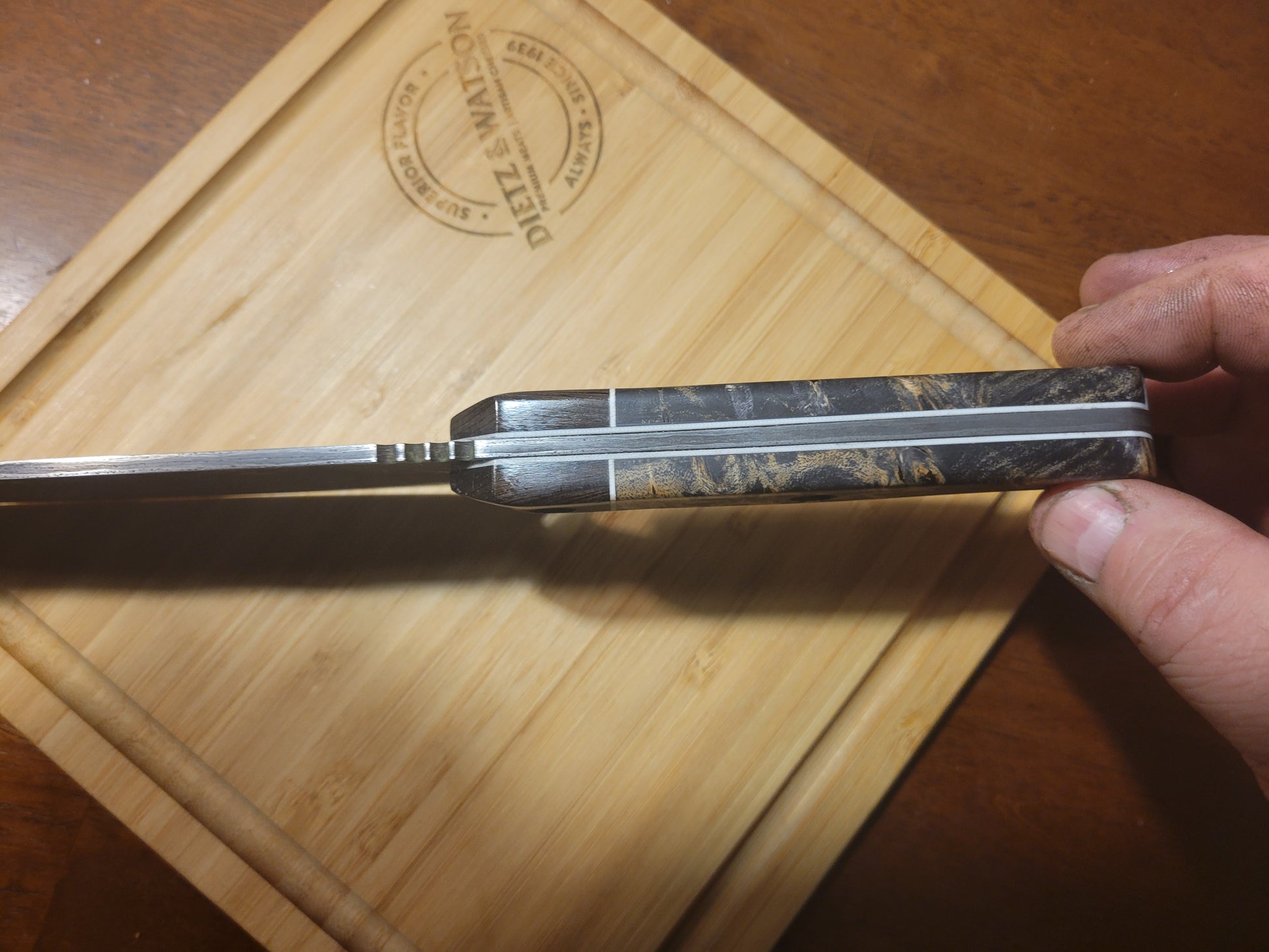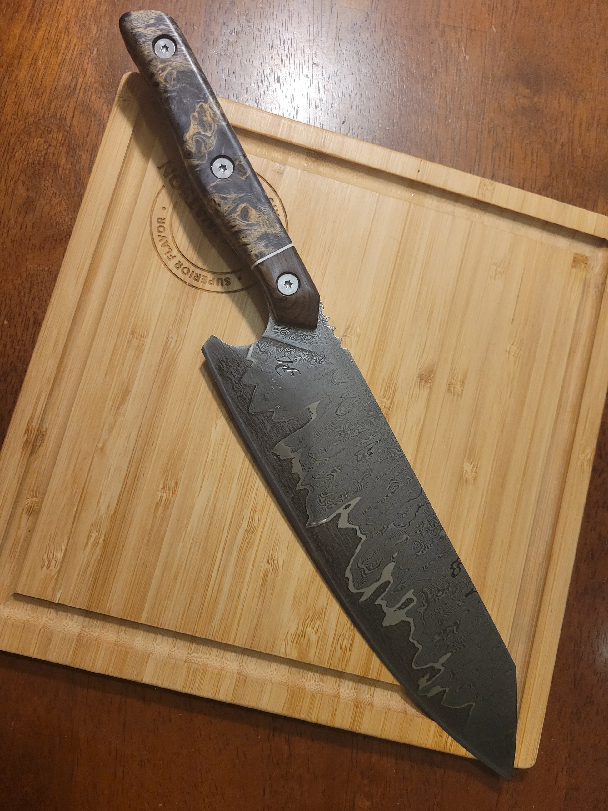 200 layer san-mia 1084 15n20 damascus with nickel shim and 1084 core comes with a stabilized wood handle. Also available in other blade and handle materials. All knives are made to order 3-4 weeks to be shipped. Email me with any changes you may want to make.