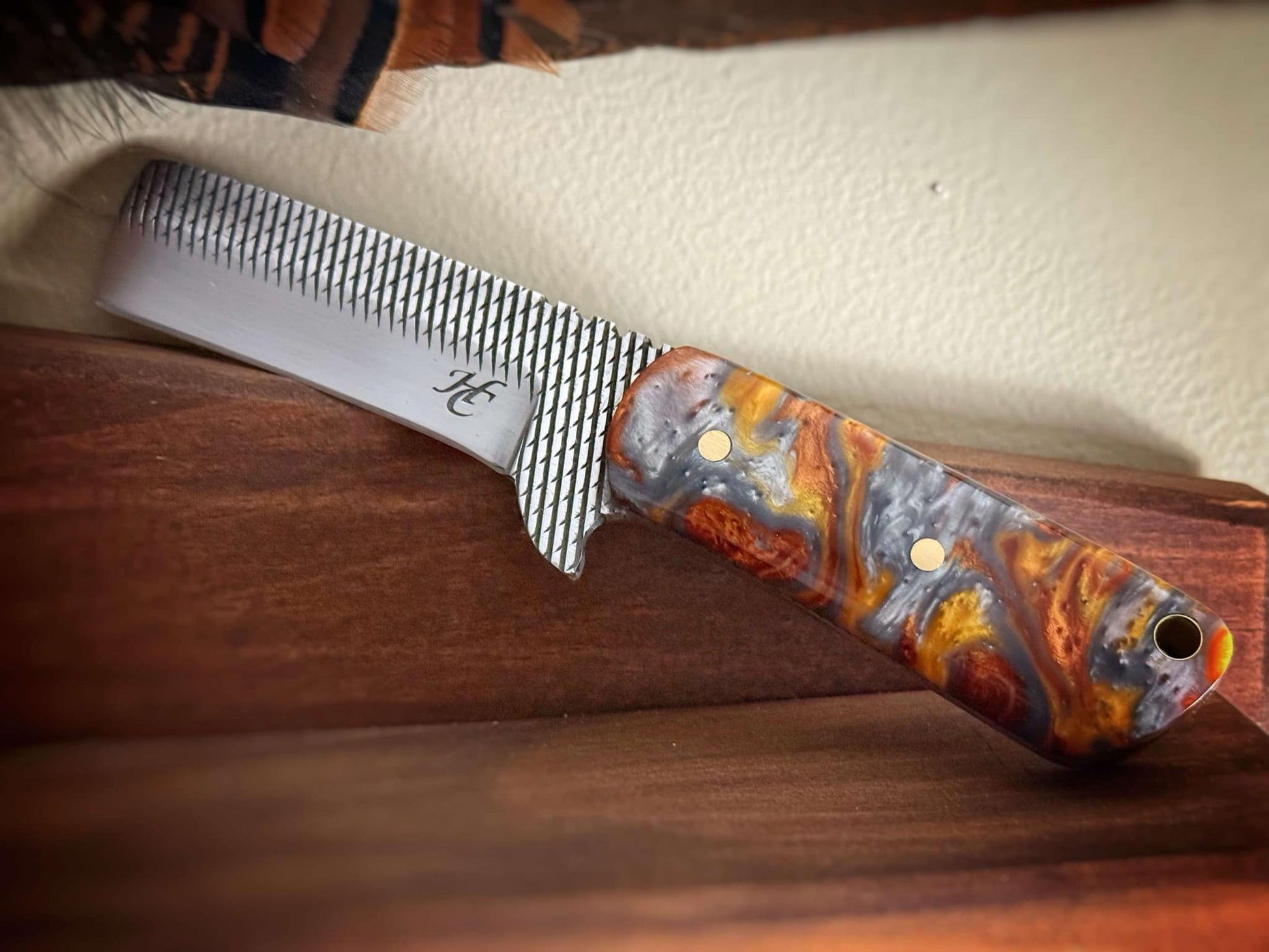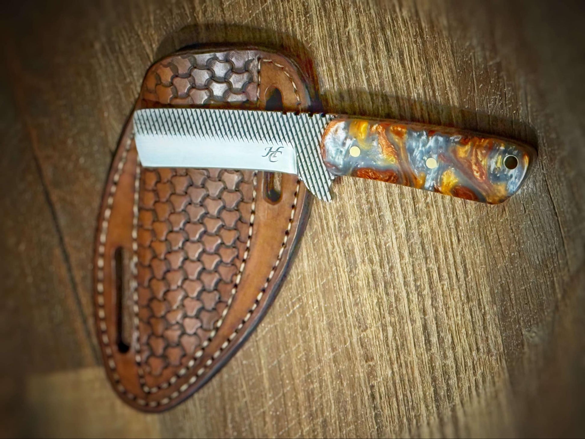 Custom made 3" ferrier rasp bull cutter knife with resin handle and yellow liners. Comes with a custom hand made sheath made to order 3-4 week to be mailed email me with any questions before ordering