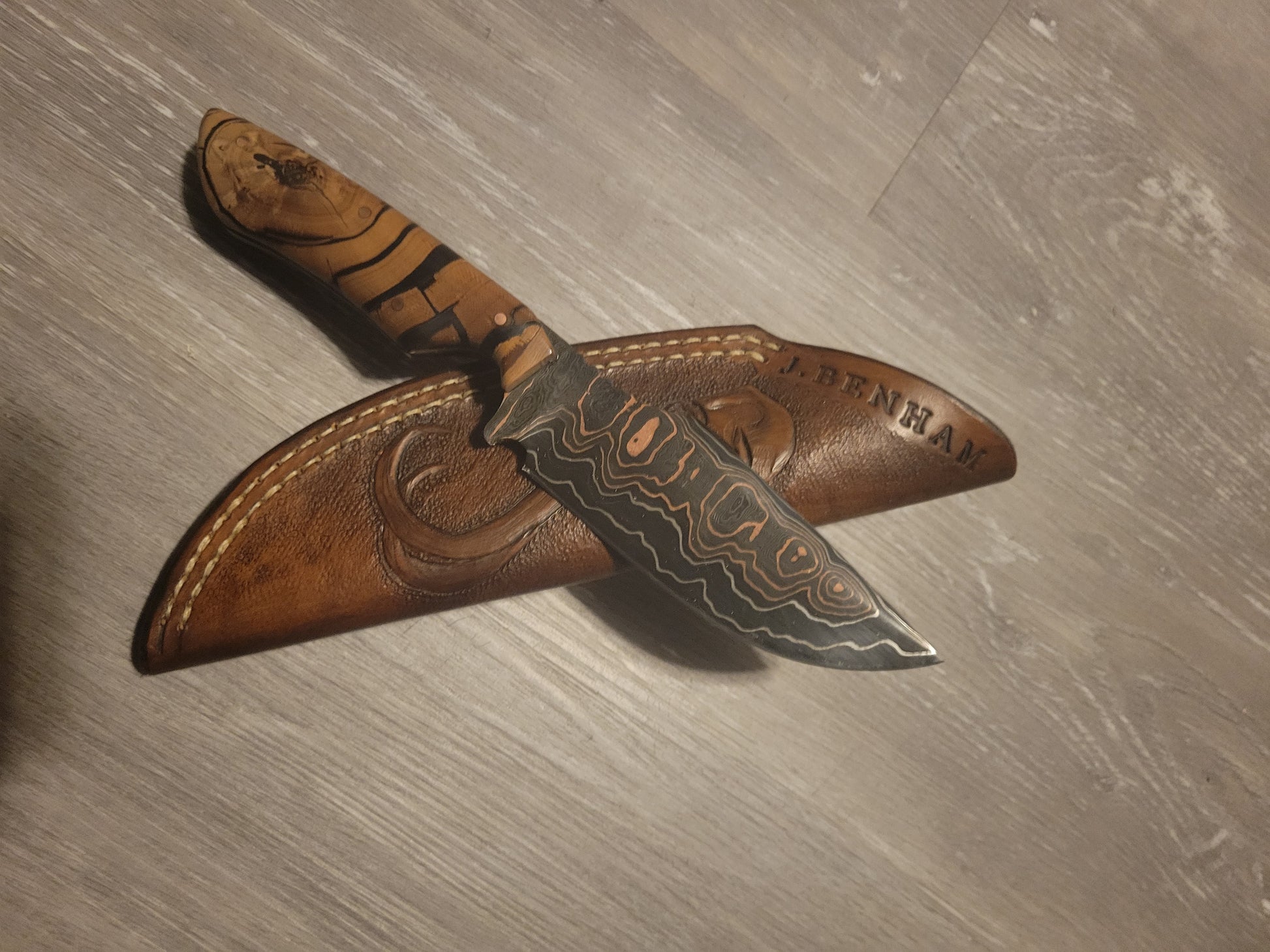 This is a hand forged multiple layer 1084 15n20 damascus with layers of copper and nickel added to it with a solid 1084 core. It has a 100 million year old mammoth tusk handle. The handle material is hard to get so may very in color and price. All knives are made to order 4-6 weeks to ship. Call or email for any questions or changes that you would like to make. Comes with custom leather sheath with your choice of tooling.
