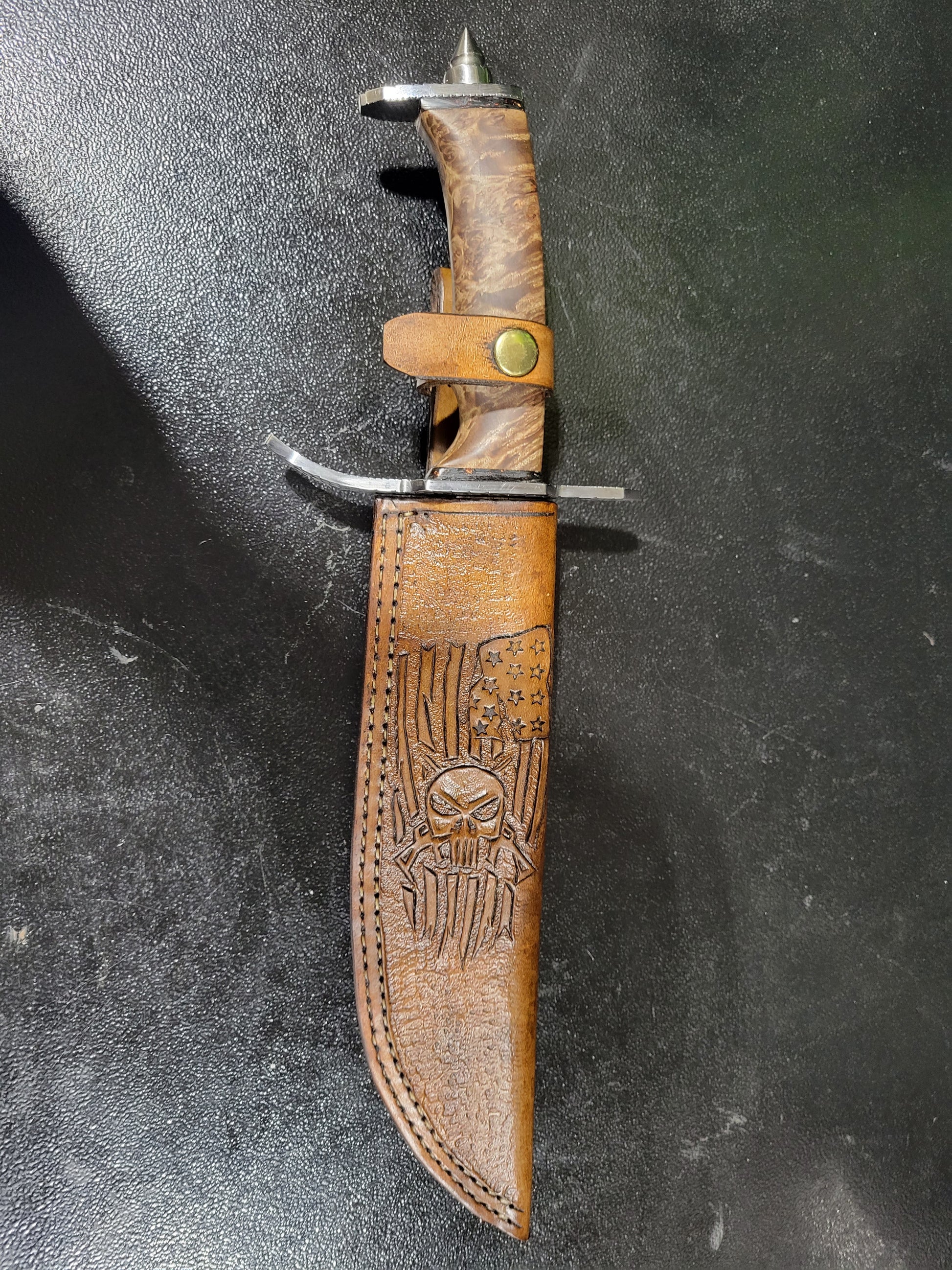 Ferrier rasp big bear hunter with 9" blade and hidden tang stabilized maple burl handle with custom sheath made to order 6-8 weeks to be shipped.