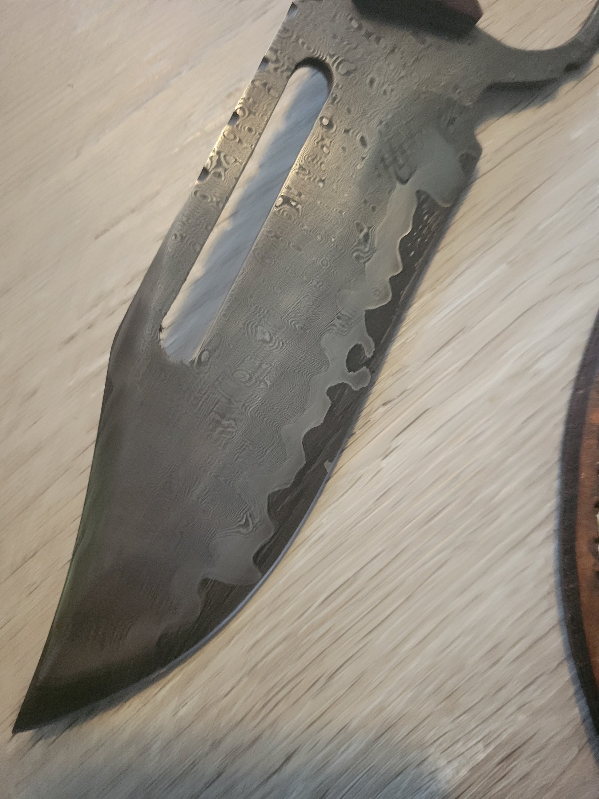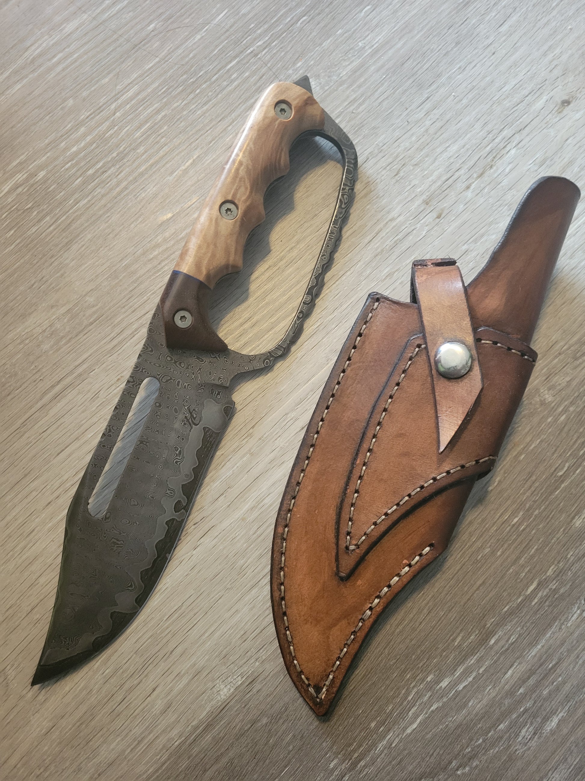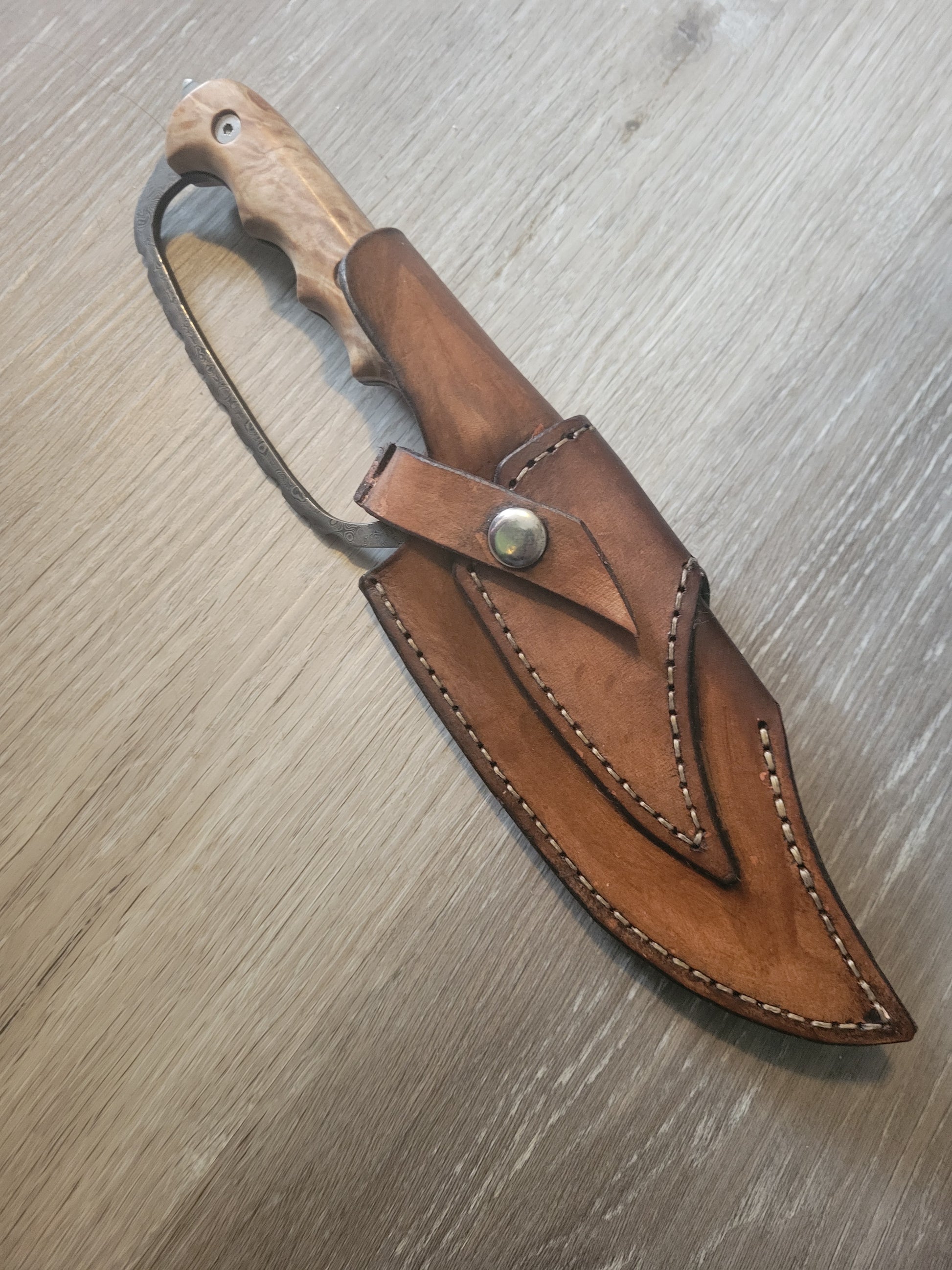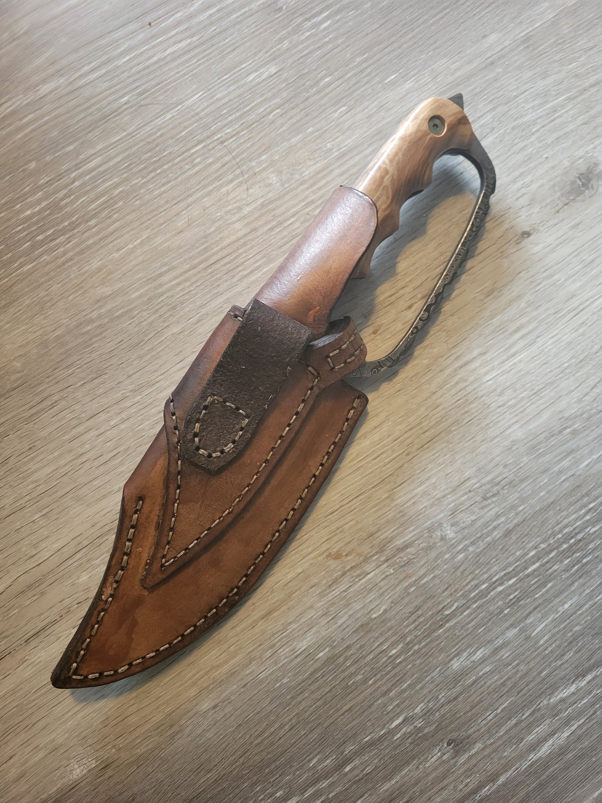Hand forged custom Full guard bear hunter is a 200 layer 1084 15n20 damascus with a 1095 core 6" blade. with a full guard and a stabilized wood handle with g10 liners and spacers. Coms with custom leather sheath. Email to make any changes it will be 4-6 weeks to build and ship.