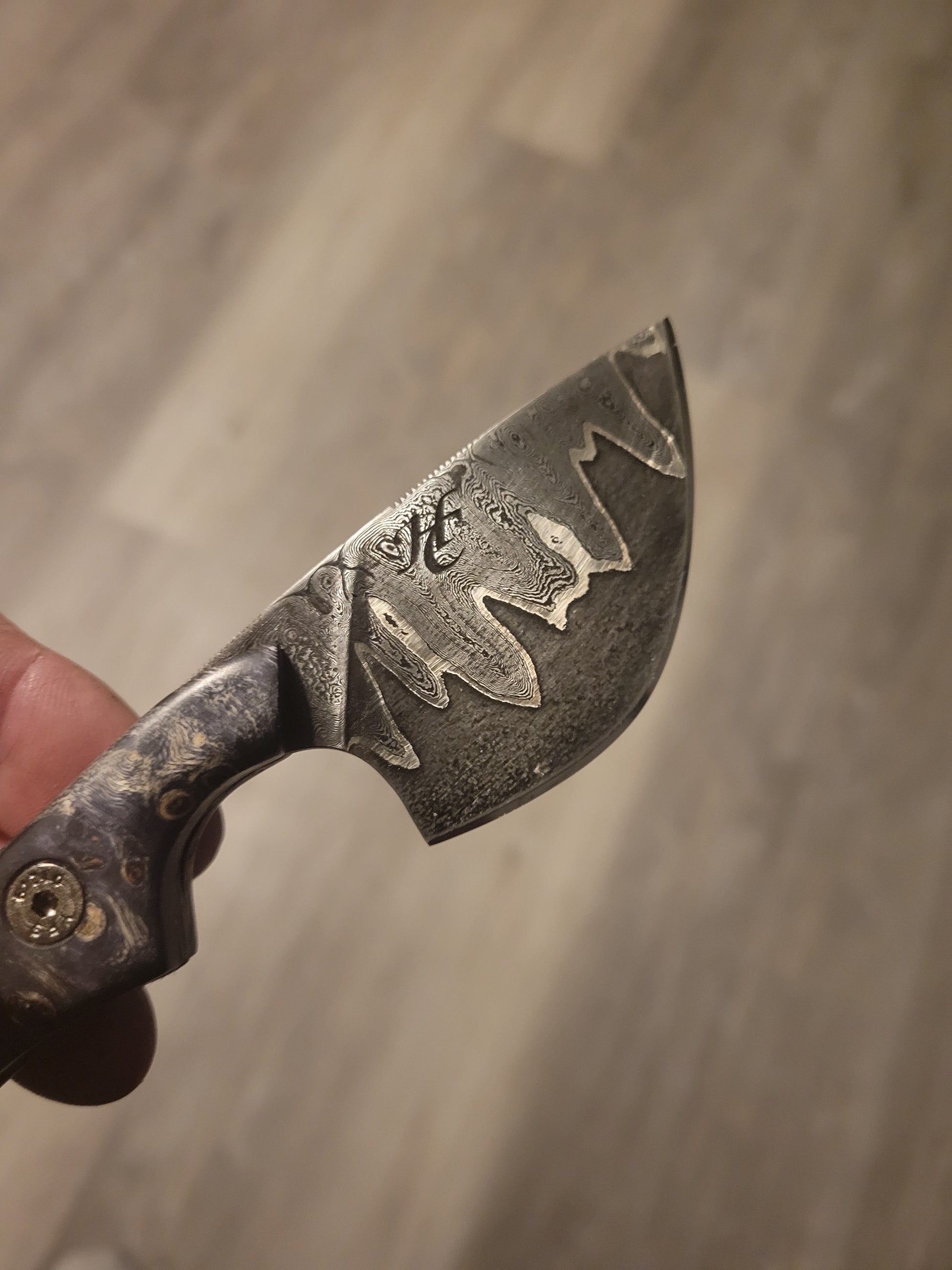 Little skinner 200 layer 1084 15n20 damascus with nickel shim and 1084 core comes with a stabilized wood handle and custom sheath. Also available in other blade materials. All knives are made to order 3-4 weeks to be shipped. Email me with any changes you may want to make.