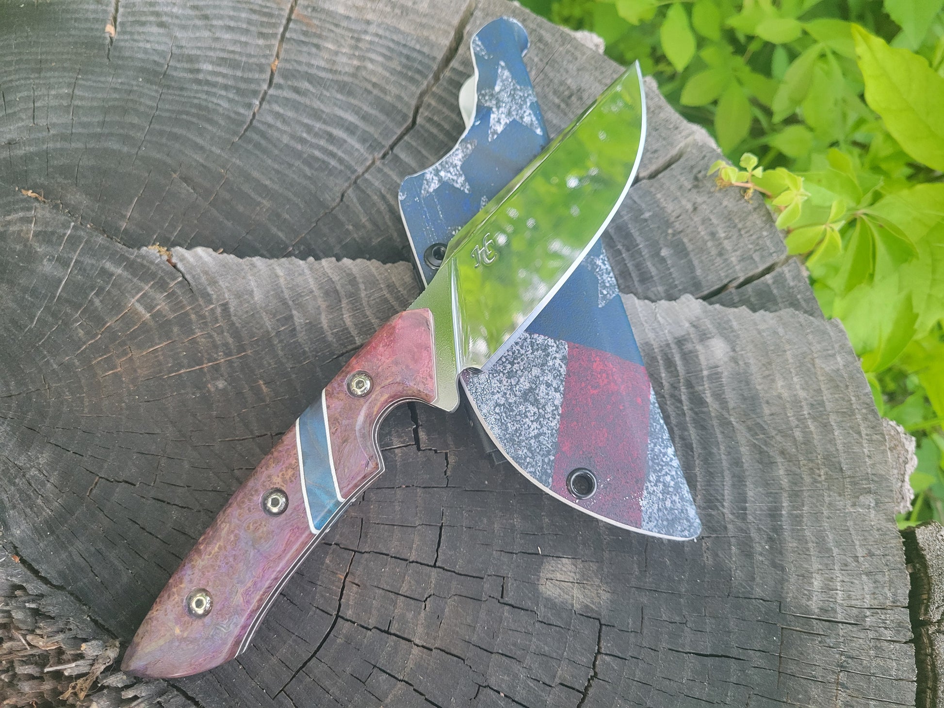 Stainless hunter with stabilized and dyed maple bural handle with g10 spacers and liners and custom kydex sheath