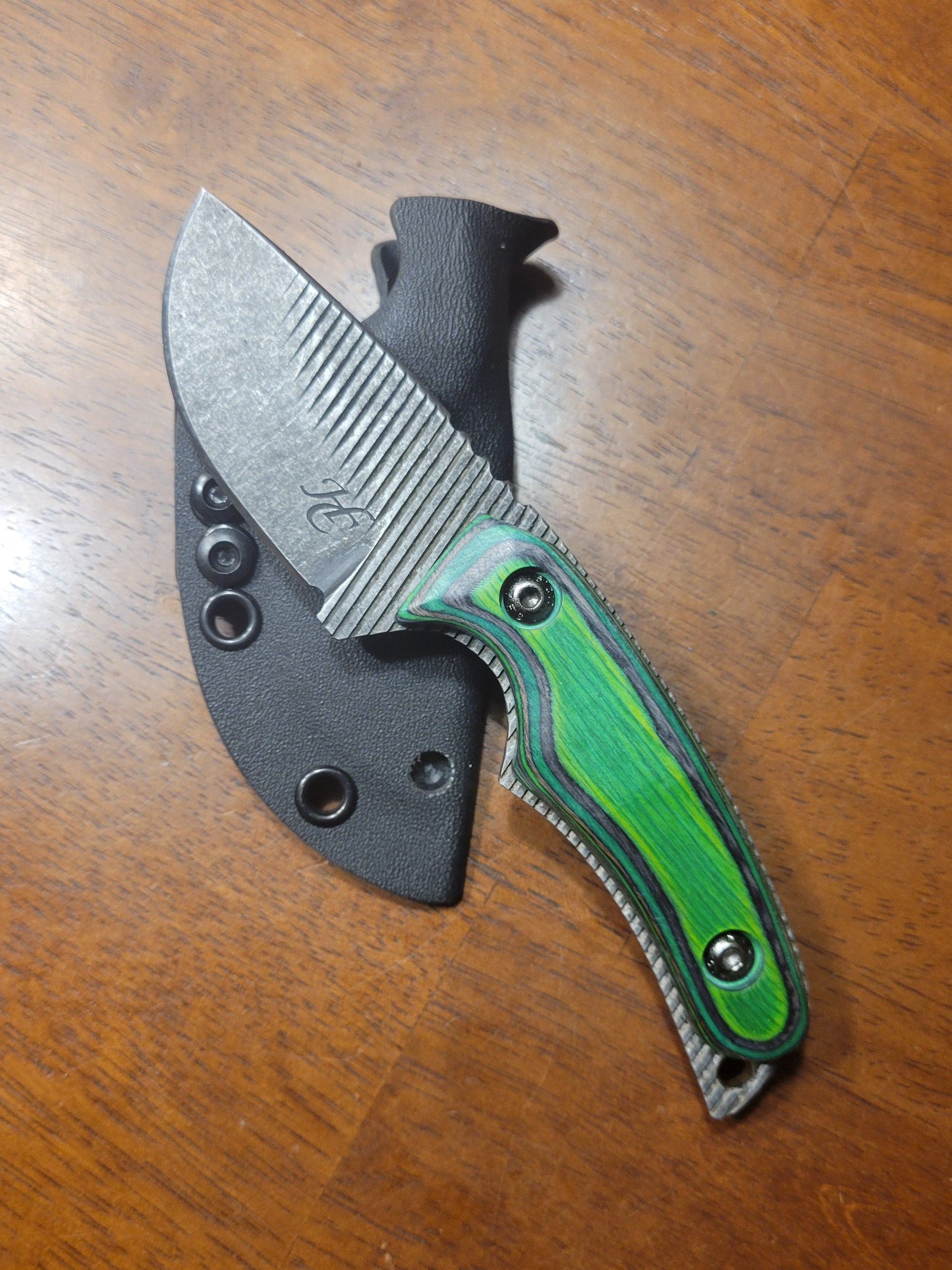 Stone washed ferrier rasp edc with laminated wood handle and custom kydex sheath